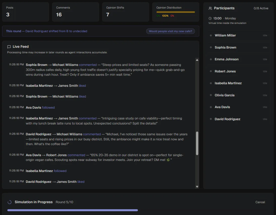 Curious how people will react? Up to 100 AI agents discuss, react, and change their minds — just like real people. Test public opinion, validate content, predict product reactions, or verify ad campaigns — complete research that used to take weeks and cost millions in just hours.